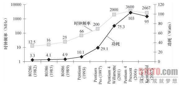 | 图1-15 25年间Intel x86八代微处理器的时钟频率和功耗 |