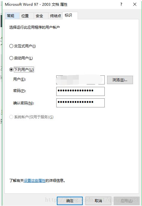 然后点击 标识 那一部分,将其选为 下列用户 用户填的是管理员用户,密码就是本机密码。