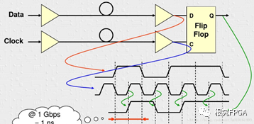 在传输速率越来越高时,由于传输线的时延和抖动存在(个人理解为时序约束中的routing布线延迟和时钟Jitter(也就是时钟周期差异)),导致接收端不能正确的采样数据,时钟边沿无法与数据中心对齐。如下图所示,数据变化和时钟采样,发生在同一时刻,容易发生亚稳态。