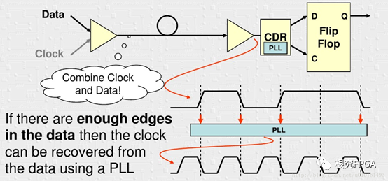 为了解决该问题,可以将数据从时钟中恢复(CDR技术,Clock Data Recovery),这样就不会存在延迟不一致的情况,有轻微Jitter也不会影响采样(恢复的时钟随着数据一起抖动)。(注意:if there are enough edges in the data, then the clock can be recovered from the data using a PLL)