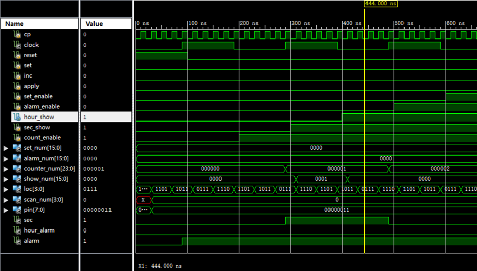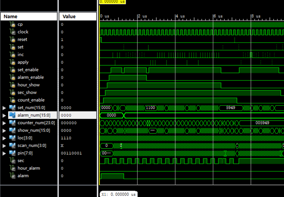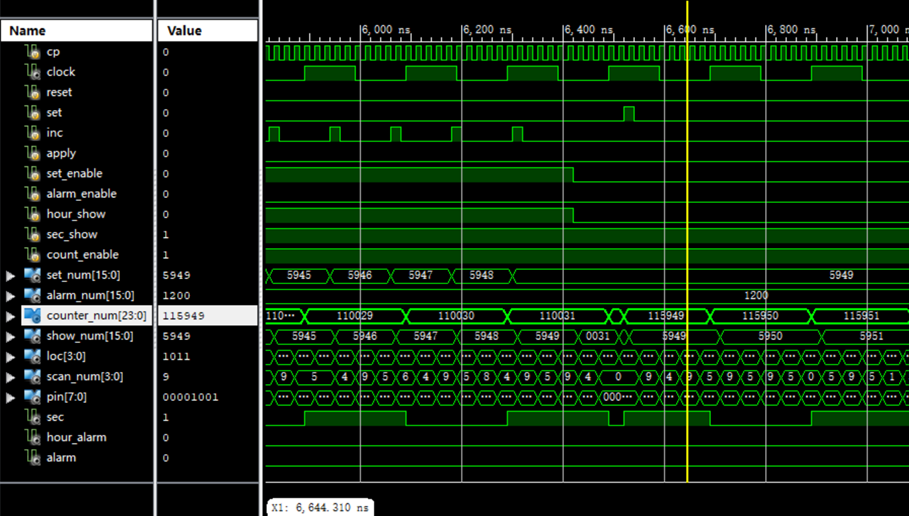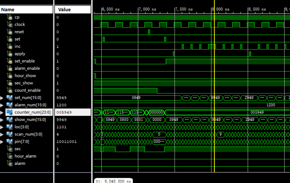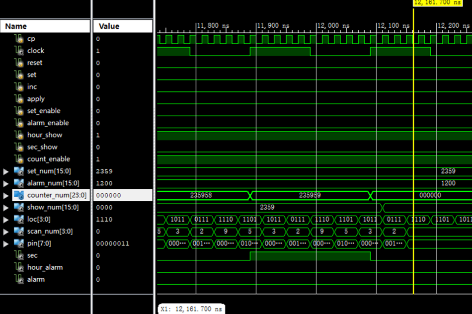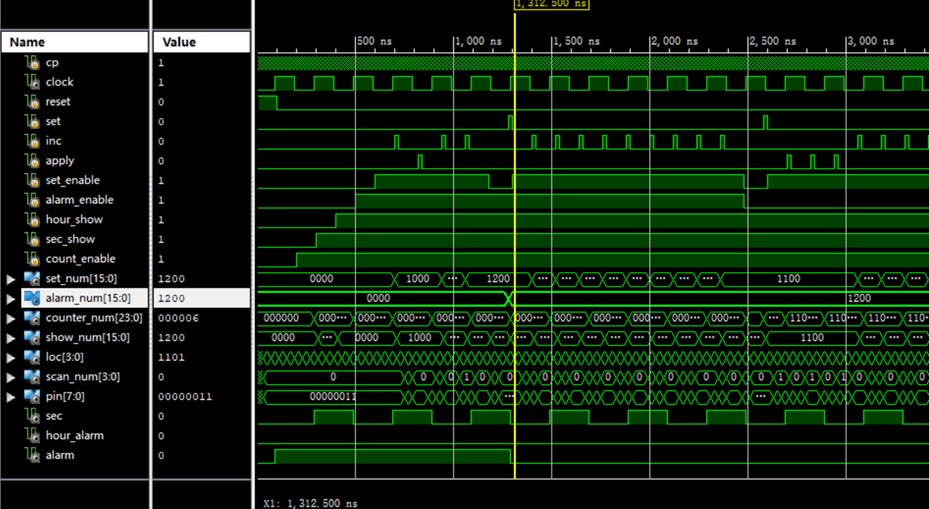 通过inc和apply按键使置数值达到1200,关闭set_enable,此时alarm_enable优先级最高,按下set按键,如黄线所示,alarm_num由0000变为1200。