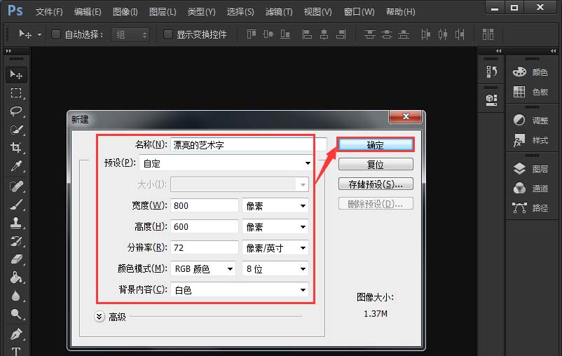 1、打开ps软件,新建一个800*600像素的白色画布,【命名为:漂亮的艺术字】方便保存之后查找,点击【确定】按钮。