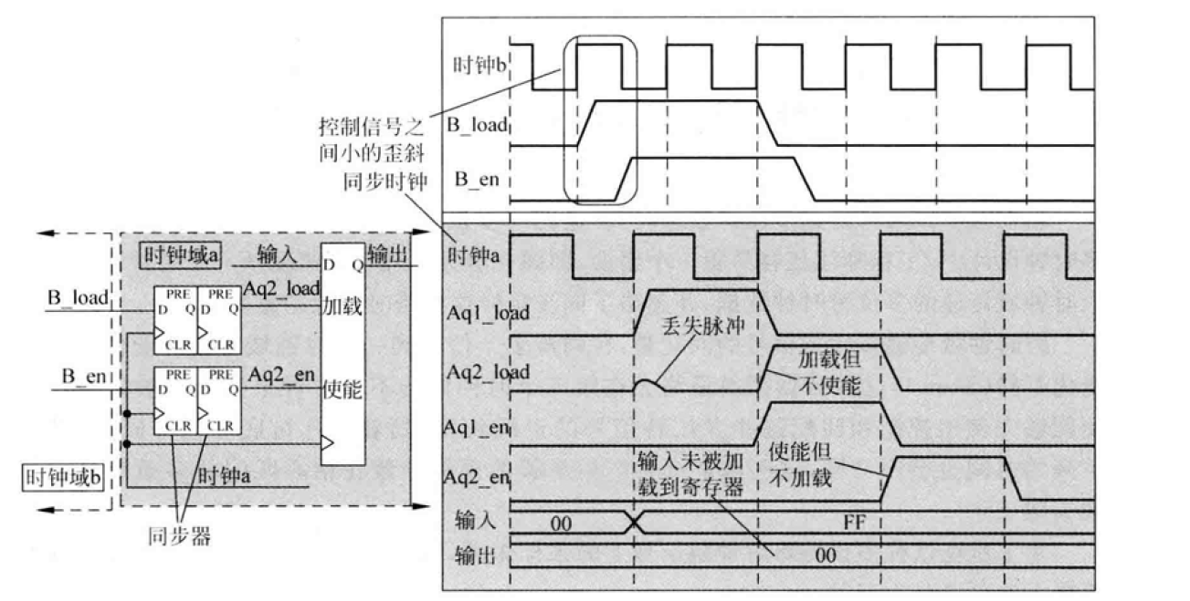 上图中,在接收时钟域有一个寄存器,它需要一个加载(load)信号和一个使能(enable)信号来加载一个数值到寄存器。如果load和enable在发送时钟域的同一个时钟沿被驱动有效(即两个控制信号需要同时有效),那么这两个控制信号之间就有可能存在产生一个小歪斜的机会,这就可能导致在接收时钟域中这两个信号被同步到不同的时钟周期,在这种情况下,数据是不能被加载到寄存器的。
