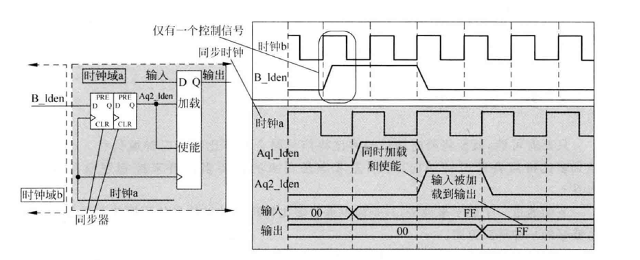 解决上述的问题就是将load和enable两个控制信号融合成一个单bit控制信号(这两个控制信号本身相同,且同时有效),如下所示,单bit控制信号同步到接收时钟域后作为一个“加载使能”信号同步驱动寄存器的加载和使能输入端口。