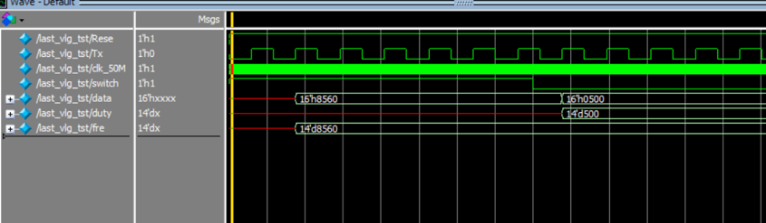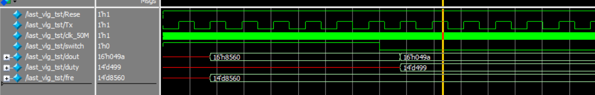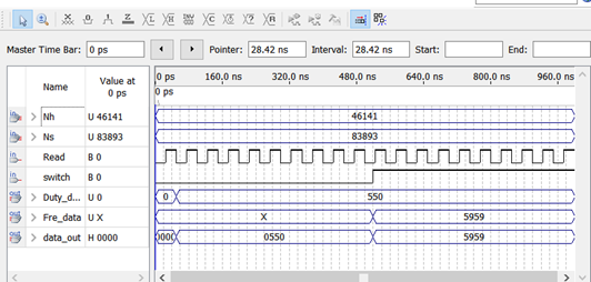 实际仿真测得Duty_data=550,fre_data=5959频率与理论测量值相差1,但误差满足设计要求。