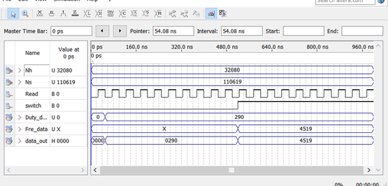 Nh为占空比计数值,Ns为频率计数值,Read为读信号,switch为占空比频率输出转换开关,Duty_data为占空比值*10,Fre_data为频率值*10(因为测量精度为小数点后一位),