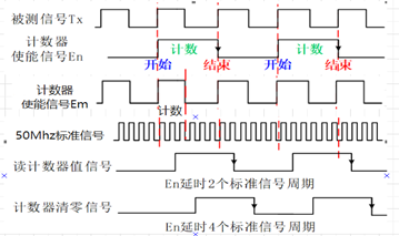如图 4所示,输入被测信号后,经过二分频模块得到信号En,在En为高电平时,计数标准信号周期个数Ns,Em同被测信号;当En与Em同时为高时,计数标准信号周期个数Nh;