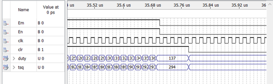 实际仿真测得Duty_data=290,Fre_data=4519。频率与理论值相差1,误差符合设计要求。