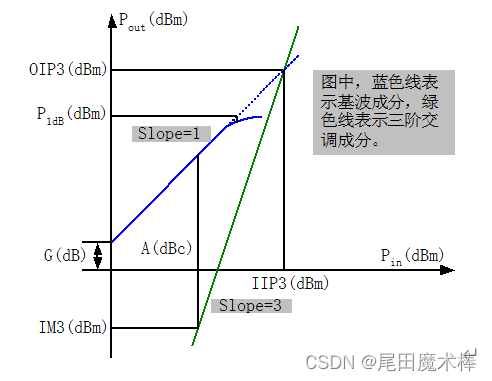 对于线性部分的任意输入功率Pin,IMD3(也就是A)可以表示为两条曲线的差,即为