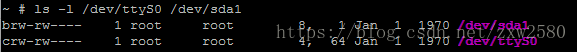 # ls -l /dev/ttyS0 /dev/sda1