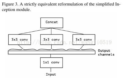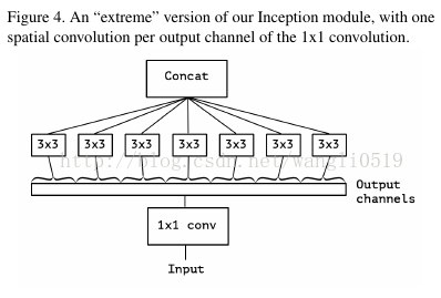 这个Inception模块可以转换成1×1卷积,然后在输出通道不重复的区块进行空间卷积。