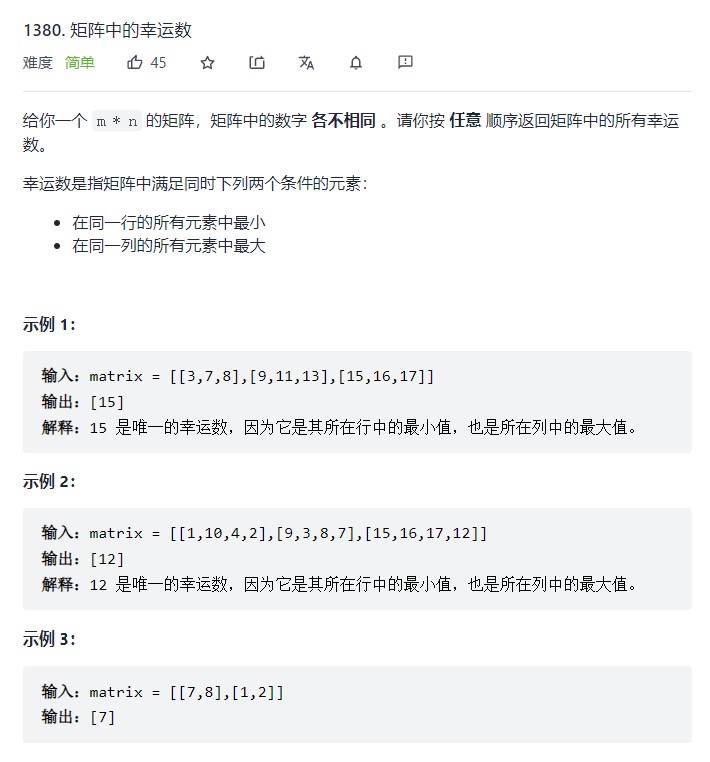 1380. 矩阵中的幸运数 - 力扣(LeetCode) (leetcode-cn.com)