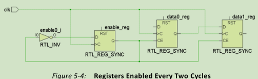 当数据逻辑较为复杂,延时较大时,使得数据无法在一个时钟周期内稳定下来或是需要将数据发送几个周期后才使用。一般会使用时钟使能控制数据捕获,如图所示:
