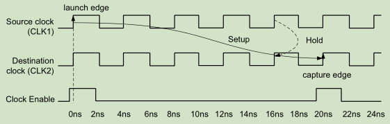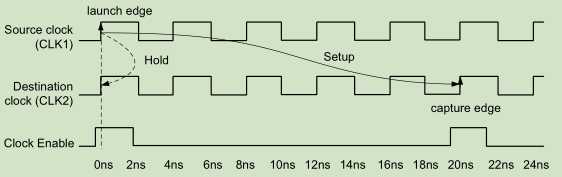 假设CLK2频率是CLK1的三倍,接收寄存器需要一个时钟使能信号才能将数据正确捕获数据,默认的时序检查如下图所示: