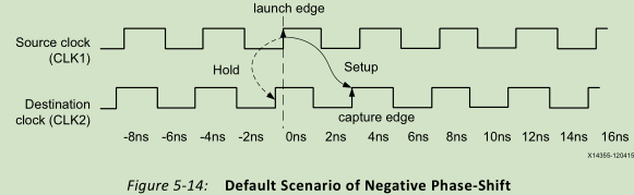 在比较小的负相移的情况下,默认时序检查如图下所示,在两个时钟域之间,用于setup和hold检查的发射和捕获边沿类似和单一时钟域,没有相移的很像,不用更改约束。
