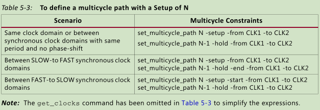 set_multicycle_path <path_multiplier> [-setup|-hold] [-start|-end] [-from <startpoints>] [-to <endpoints>] [-through <pins|cells|nets>]