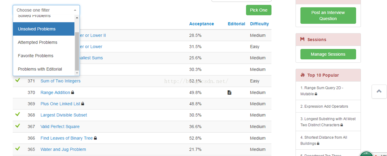 每个题目前面的小箭头表示该题已经完成。题目列表最上方有一个Choose one filter,可以将已完成的题目从列表中去掉。