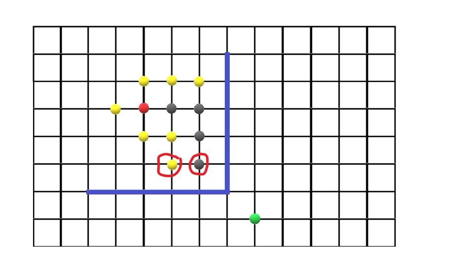 红色为起点,绿色为终点,灰色为搜索过列表中的点,黄色为待搜索列表中的点,蓝色的是障碍。