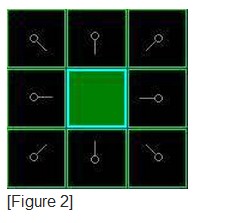 图中被暗绿色包围的就是openlist中的点,一共八个,都是从起点A可达的点,并且他们中的每个都有一个指向他们父节点的指针(图中的小针方向)被高亮绿色包围的表示closelist中的点,可以看出起点A已经在closelist中。