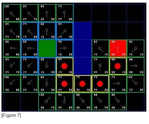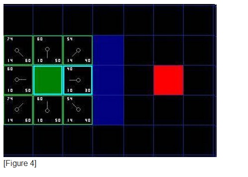 处理的结果是closelist中现在有三个元素,用高亮的蓝色标记,同样的,openlist中的元素用暗绿色标记出。
