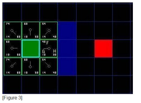H:H能用很多方法得到估计值.这里用到的方法称为Manhattan method,H的值就是从考虑的点通过水平和垂直移动达到目标点的移动步数乘10(正方形块的边长为10).注意只是水平和垂直移动,不走斜线。并且忽略图中的障碍物。