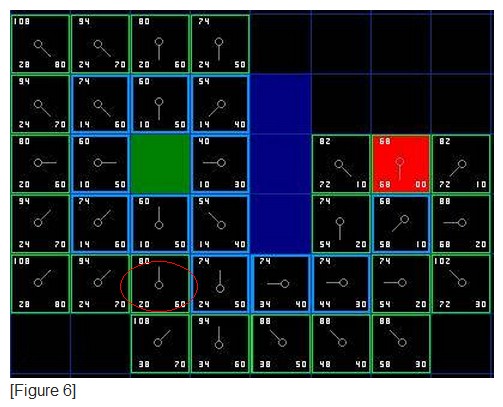 下一步的操作和上面叙述的一样,从openlist中找出F最小的,重复上的操作。从图中可以看出,现在的openlist中F最小的有两个,就是刚刚考虑的点的正上方和正下方,其实这里选哪个都无所谓,只是人们习惯于选择较晚加入到openlist中的元素,这里选择下方的点。