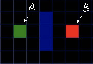 如图所示简易地图, 其中绿色方块的是起点 (用 A 表示), 中间蓝色的是障碍物, 红色的方块 (用 B 表示) 是目的地. 为了可以用一个二维数组来表示地图, 我们将地图划分成一个个的小方块.