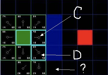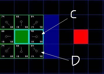 然后我们继续从 "开启列表" 中找出 F 值最小的, 但我们发现 C 上面的和下面的同时为 54, 这时怎么办呢? 这时随便取哪一个都行, 比如我们选择了 C 下面的那个方块 D.