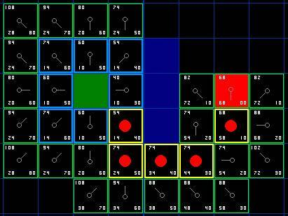 6. 如果某个相邻方格 D 已经在 "开启列表" 里了, 检查如果用新的路径 (就是经过C 的路径) 到达它的话, G值是否会更低一些, 如果新的G值更低, 那就把它的 "父方格" 改为目前选中的方格 C, 然后重新计算它的 F 值和 G 值 (H 值不需要重新计算, 因为对于每个方块, H 值是不变的). 如果新的 G 值比较高, 就说明经过 C 再到达 D 不是一个明智的选择, 因为它需要更远的路, 这时我们什么也不做.