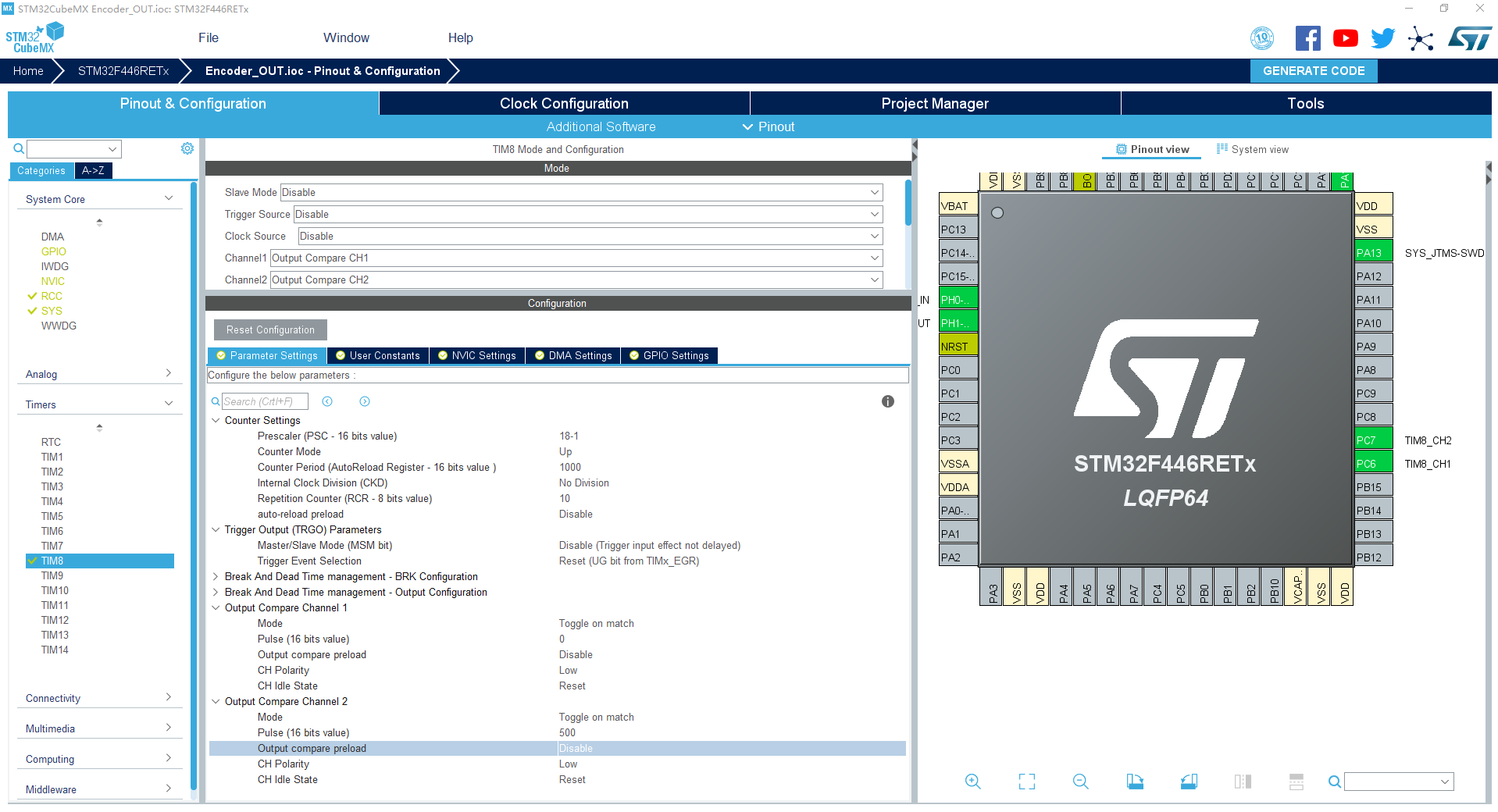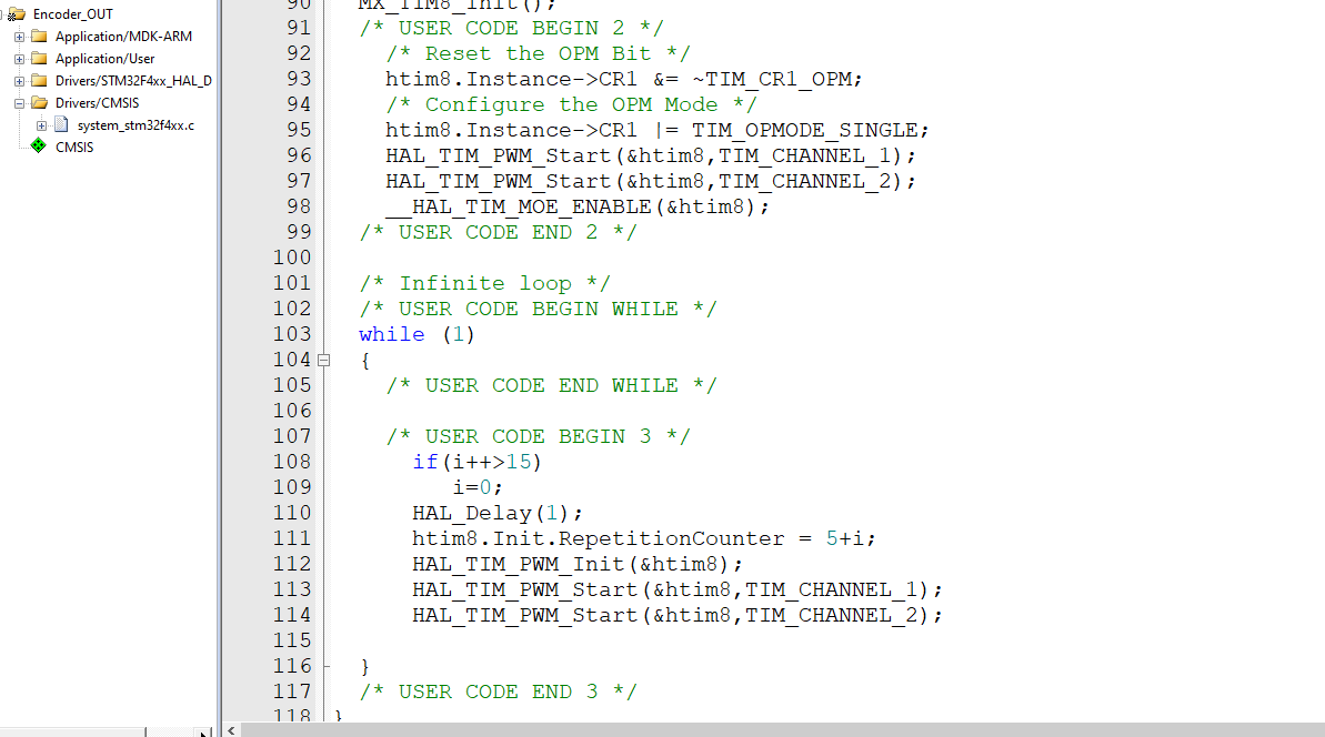 最终采用 高级定时器单脉冲模式+比较输出实现 单脉冲模式脉冲数8位 最高255个脉冲 对于低压伺服来说 20Khz 编码器采集频率,255个脉冲已经能满足很高精度的编码器了。Tim1定时器用来做三相PWM了,所以用高级定时器Tim8来实现