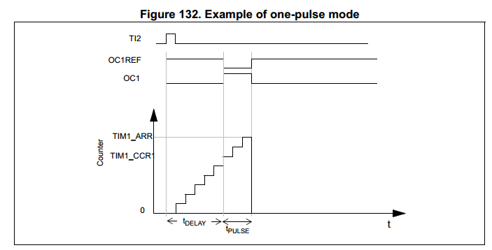 上图的意思是,TI2收到1给正脉冲,触发TIM1开始计数,经过 tDelay后,OC1输出低,经过一个tPulse后,OC1又恢复为高。