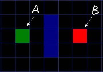 如图所示简易地图, 其中绿色方块的是起点 (用 A 表示), 中间蓝色的是障碍物, 红色的方块 (用 B 表示) 是目的地. 为了可以用一个二维数组来表示地图, 我们将地图划分成一个个的小方块.