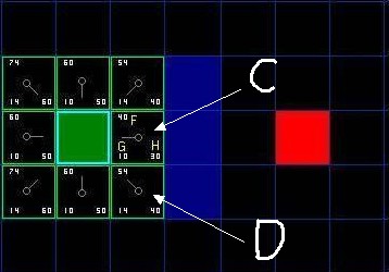 从 "开启列表" 中选择 F 值最低的方格 C (绿色起始方块 A 右边的方块), 然后对它进行如下处理: