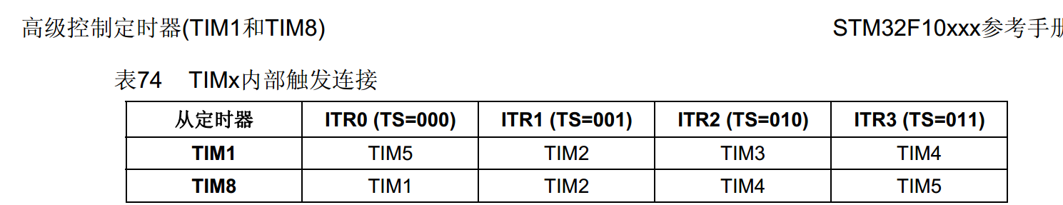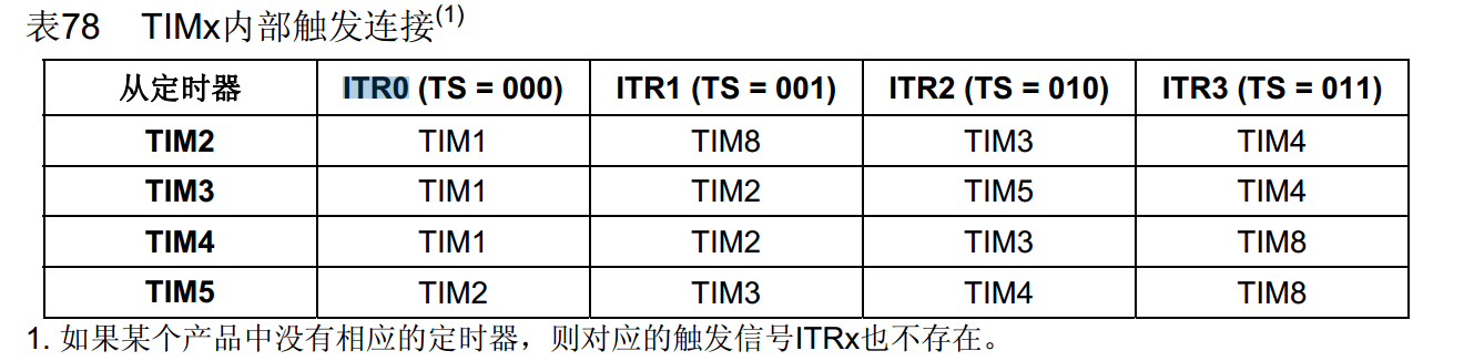 其中/TIM_SelectInputTrigger(TIM1, TIM_TS_ITR2);中的参数需要注意,参考手册查对应的可用连接,如下:
