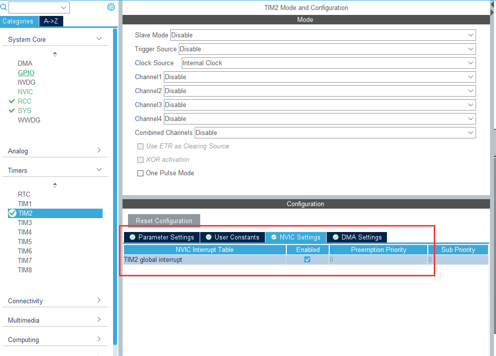 例如,定时时间为 1ms,可设置Prescaler = 72-1;Counter = 1000 - 1;(TIM2时钟频率设置为72MHz)