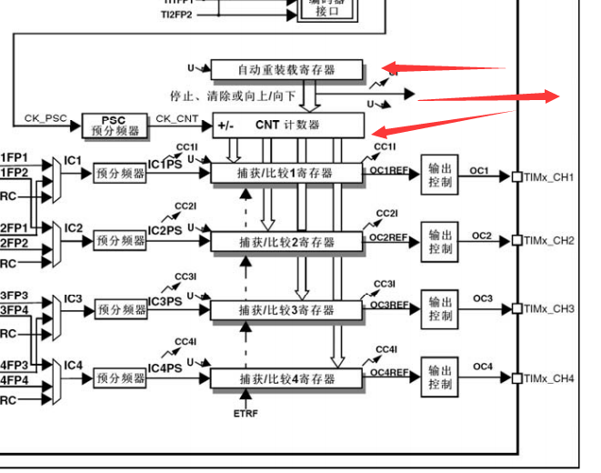 其实输出比较的意思可以看这个文件可以看出来就是进入psc分频,然后CNT开始计数,设定一个重装载得置,在这个置得中间产生一个事件信号,就是设置CCR得值得信号,因为PWM波形一定是要在这个值之内才有意义,不然超过了或者等于的时候,那么占空比是100%就没有意义了。所以这个产生的事件一定是要在这个值的范围内。也就是设置停止位。