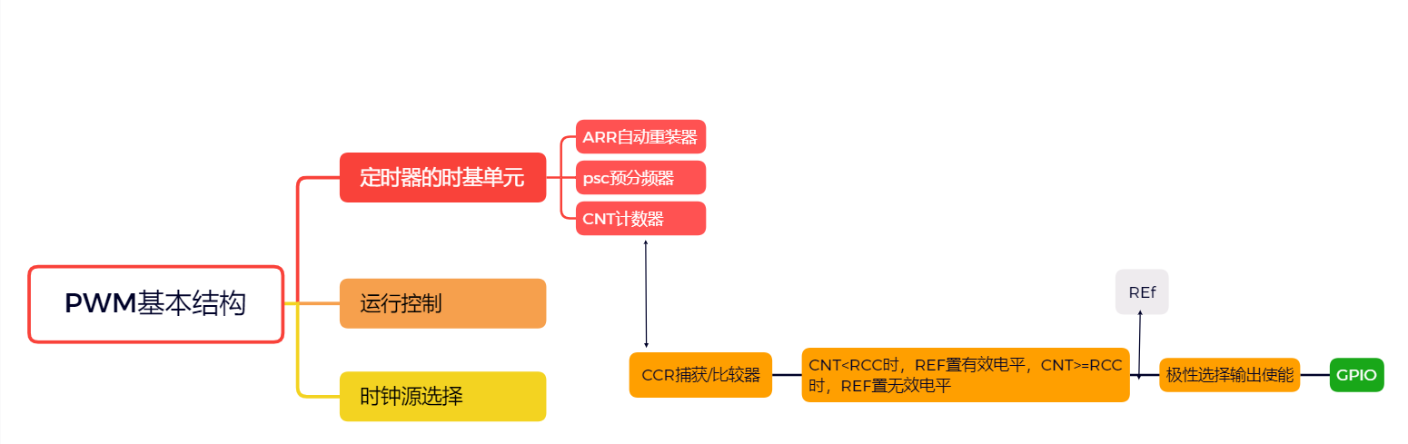 简单了解一下PWM波形就是利用定时器TIM比较器生成,就是根据CNT计时,然后PWM模式的CCR设置一个位置在0~RCC的位置,当CNT计时到CCR持平的位置就值0或者置1。