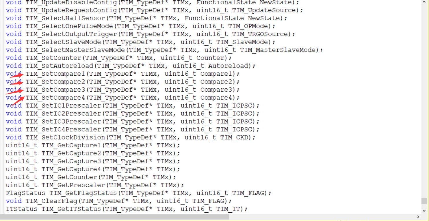 这里也是每个通道对应一个改变比较值,这个函数意思就是设置比较值,就是CCR的值,这里意思四个通道。参数1很明了了就是设置TIM几定时器几的意思,这里是TIM2。参数2就是一个比较值,这个值可以是参数值。uint16_t,这个数据类型的范围都可以。
