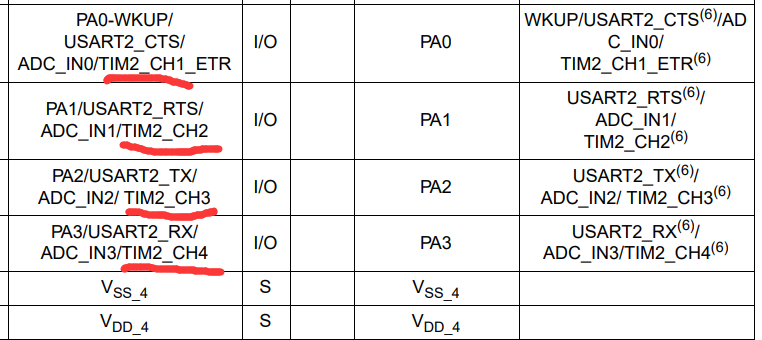 可以看一下这个引脚图,PA0对应着TIM2——CH1意思就是定时器2,输出通道1的意思,也就是说用到了PA0的引脚作为PWM生成的话就要配置定时器2和通道1这个功能,否则是不会有效的,这里注意就是只有引脚有标明TIM和CH这些标出才可以使用PWM输出,否则是不行的,往下面看PA1 PA2这些引脚其实都是一样的看定时器看通道,配置相应的就行了,这些都是大同小异的。