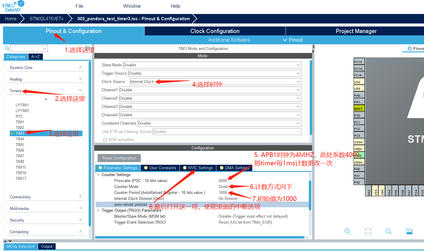 《STM32CubeMX使用-1.点个灯(正点原子潘多拉开发板)》,然后按照如下图的步骤1~8来配置定时器,配置完成后点击GENERATE CODE生成工程代码。。