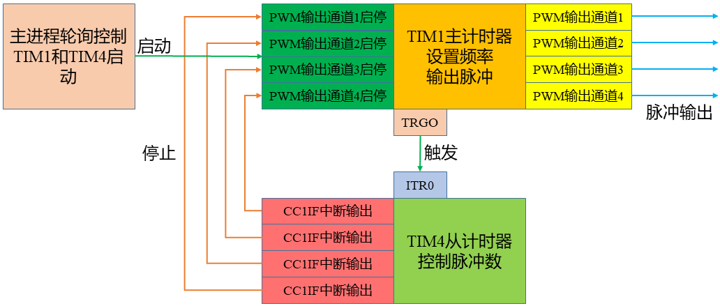 在这一系统中,我是使用STM32F407作为实现平台,以TIM1作为主计时器,TIM4作为从计时器,同时输出四路脉冲信号。四路的频率是相同的,但每一路的输出数量是可以设定的。具体的操作结构如下图所示: