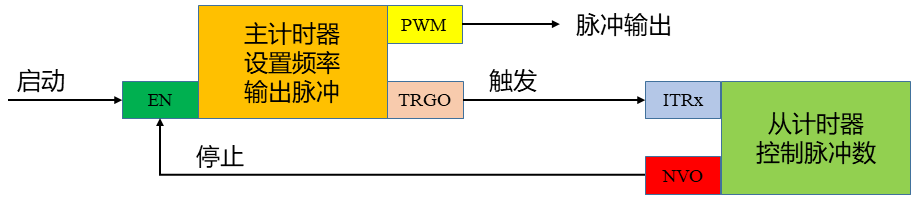 可是为什么主从计时器就能实现精确数量的脉冲输出呢?我们借助下面的简单图示来说明这个问题。
