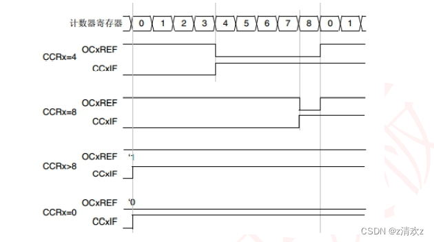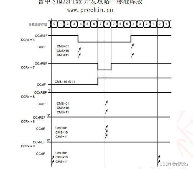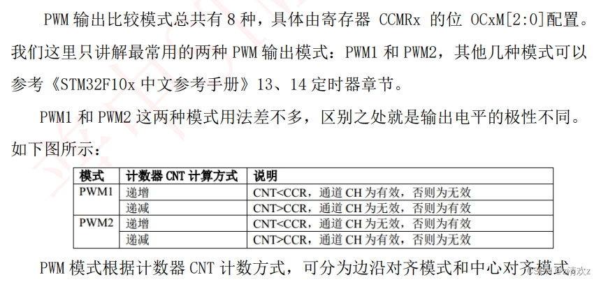 我们以 ARR=8,CCRx=4 为例进行介绍。第一阶段计数器 CNT 工作在递增计数 方式,从 0 开始计数,当 TIMx_CNT < TIMx_CCRx 时,PWM 参考信号 OCxREF 为 有效的高电平,当 TIMx_CNT >= TIMx_CCRx 时,PWM 参考信号 OCxREF 为无效的 低电平。第二阶段计数器 CNT 工作在递减计数方式,从 ARR 开始递减计数,当 TIMx_CNT > TIMx_CCRx 时,PWM 参考信号 OCxREF 为无效的低电平,当 TIMx_CNT <= TIMx_CCRx 时,PWM 参考信号 OCxREF 为有效的高电平。 中心对齐模式又分为中心对齐模式 1/2/3 三种,具体由寄存器 CR1 位 CMS[1:0]配置。具体的区别就是比较中断标志位 CCxIF 在何时置 1:中心模式 1 在 CNT 递减计数的时候置 1,中心对齐模式 2 在 CNT 递增计数时置 1,中心 模式 3 在 CNT 递增和递减计数时都置1