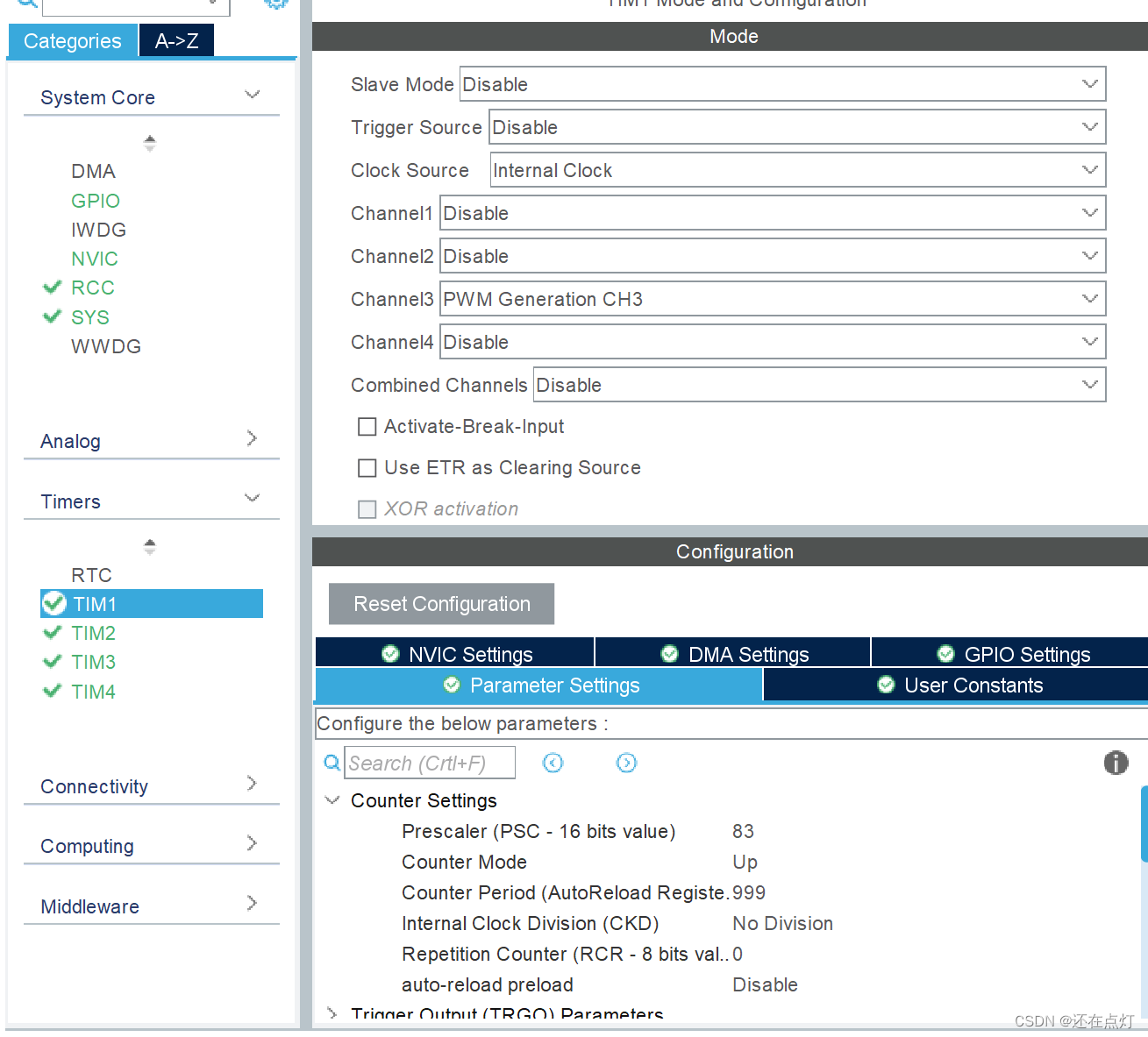 调节TIM1,4,开启响应通道的PWM产生,PSC设置为84-1,ARR设置为1000-1