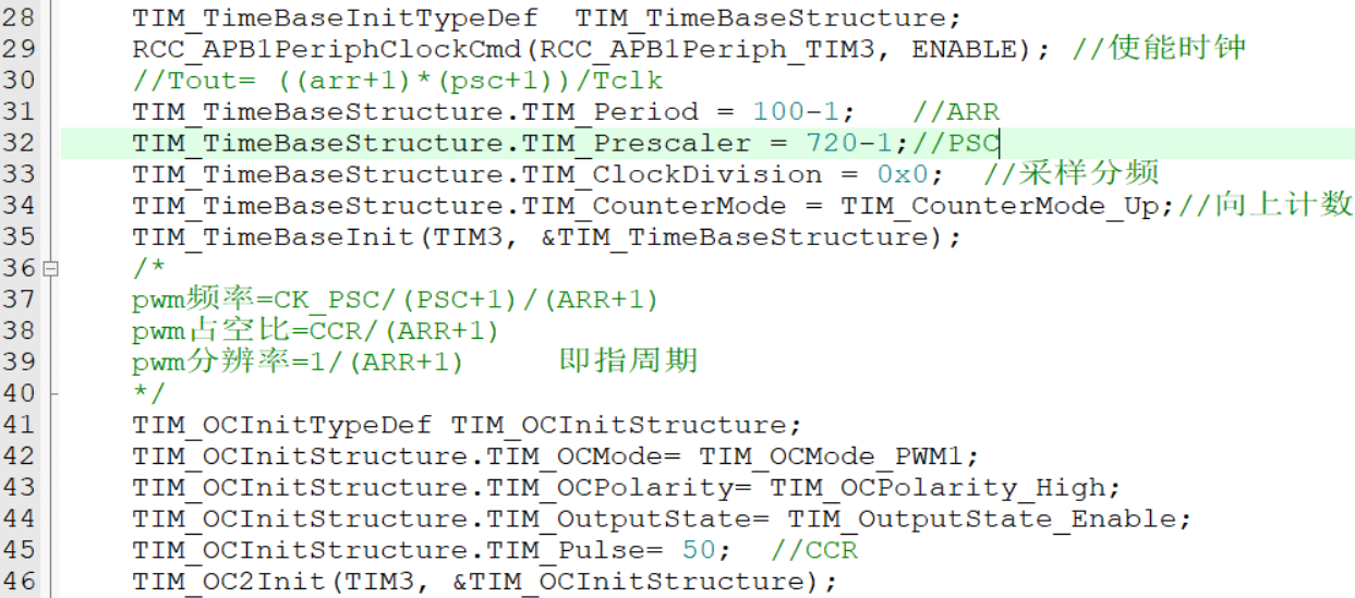 - 开启PWM时,必须同时开启AFIO时钟!!必须配置对应引脚为复用输出!!