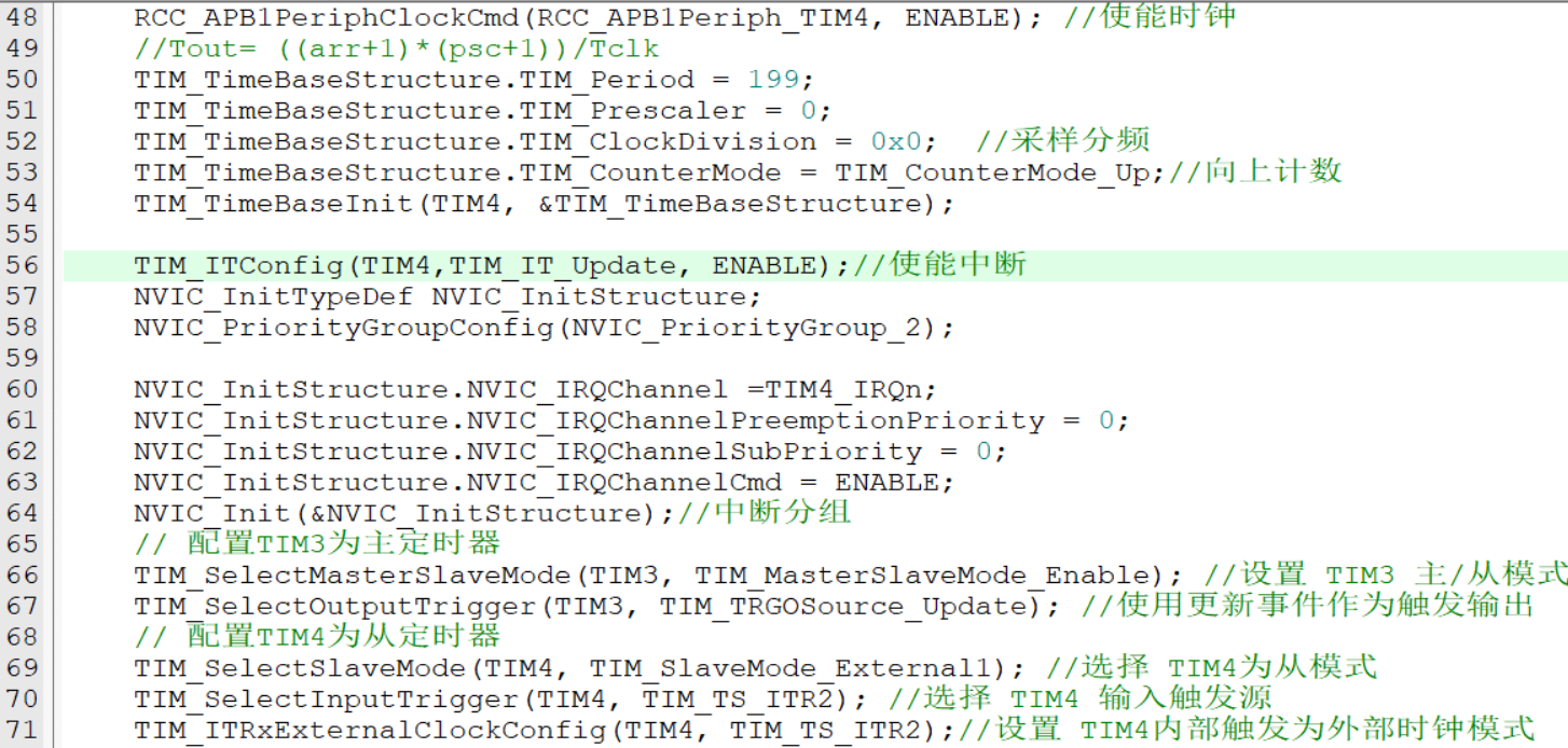 - 使能从定时器时钟,并配置基本参数。Period(即ARR)+1为期望脉冲数,达到期望数后触发中断。本例从定时器为TIM4.
