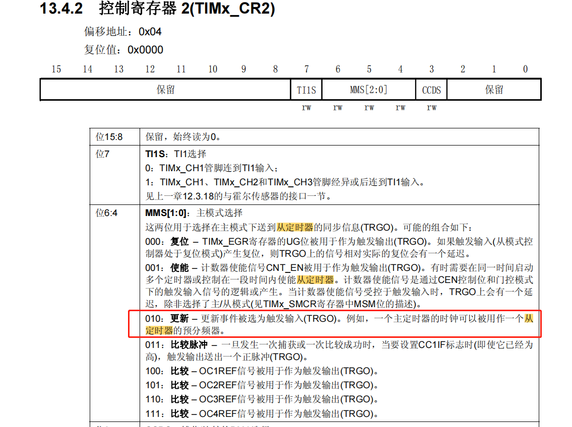 定时器2作为从定时器,需要设置从模式控制寄存器(TIMx_SMCR)中的TS位为010,