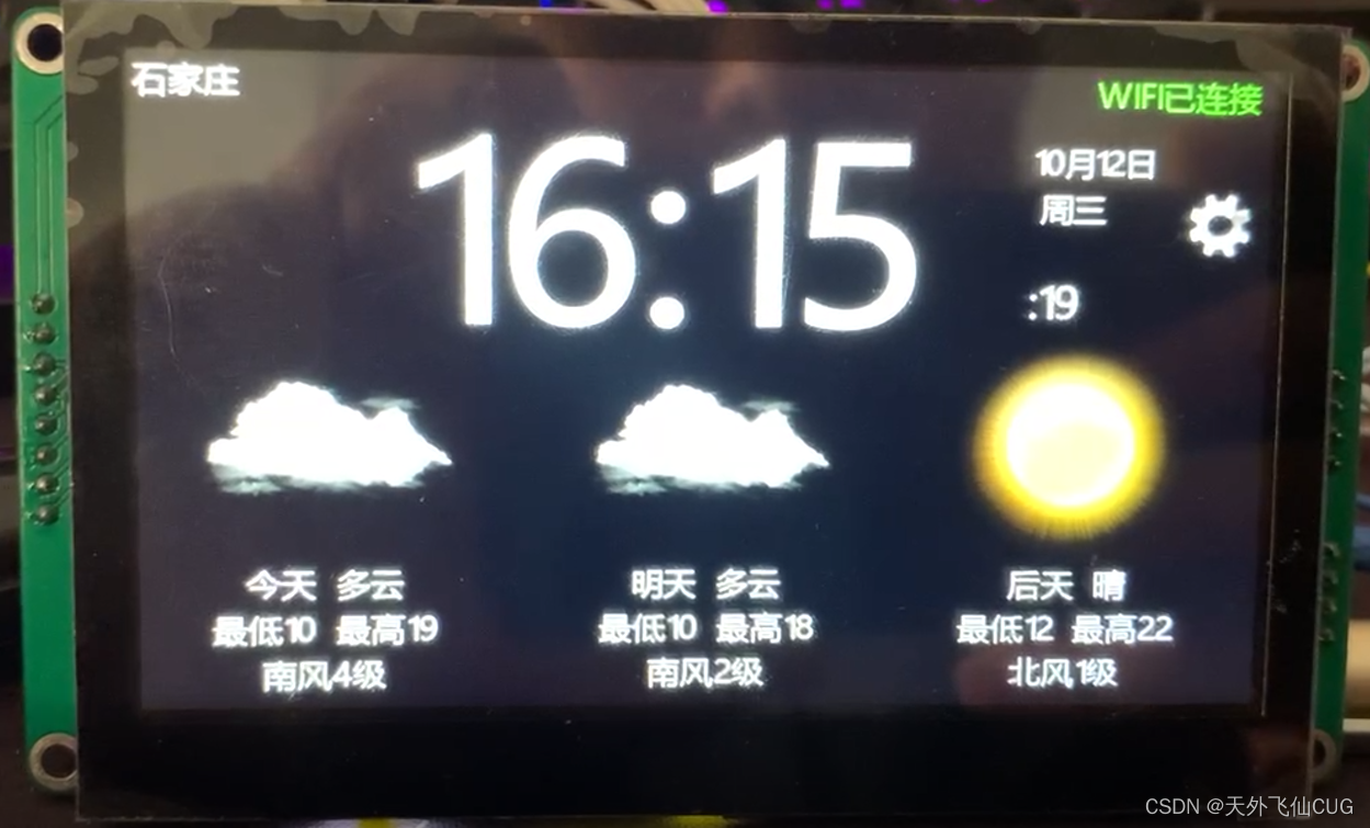 上电后程序先将SPI Flash中的图片加载到SDRAM中(前提是已经将图片从TF卡拷贝到了SPI Flash),这样显示比较快。完成之后链接WIFI,更新3天内的天气和实时时间,之后会定时更新。如果连接发生错误,会复位WIFI模块重新连接。