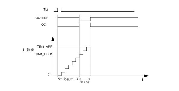 可以通过从模式控制器启动计数器,在输出比较模式或者PWM模式下产生波形。设置TIMx_CR1 寄存器中的OPM 位将选择单脉冲模式,这样可以让计数器自动的产生下一个更新