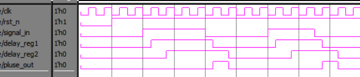 3、 delay_reg1取反然后与 delay_reg2相与产生单周期脉冲pluse_out。
